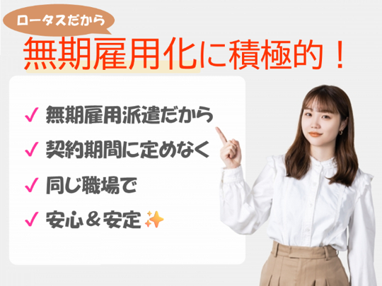 | ※職場の環境 | ・20代活躍中 ・30代活躍中 ・ロータススタッフさん活躍中 ・男性多め ・禁煙、分煙 ・服装自由 ・スニーカーOK ・冷蔵庫あり ・電子レンジあり ・フリードリンク有 ・ウォーターサーバー有 |